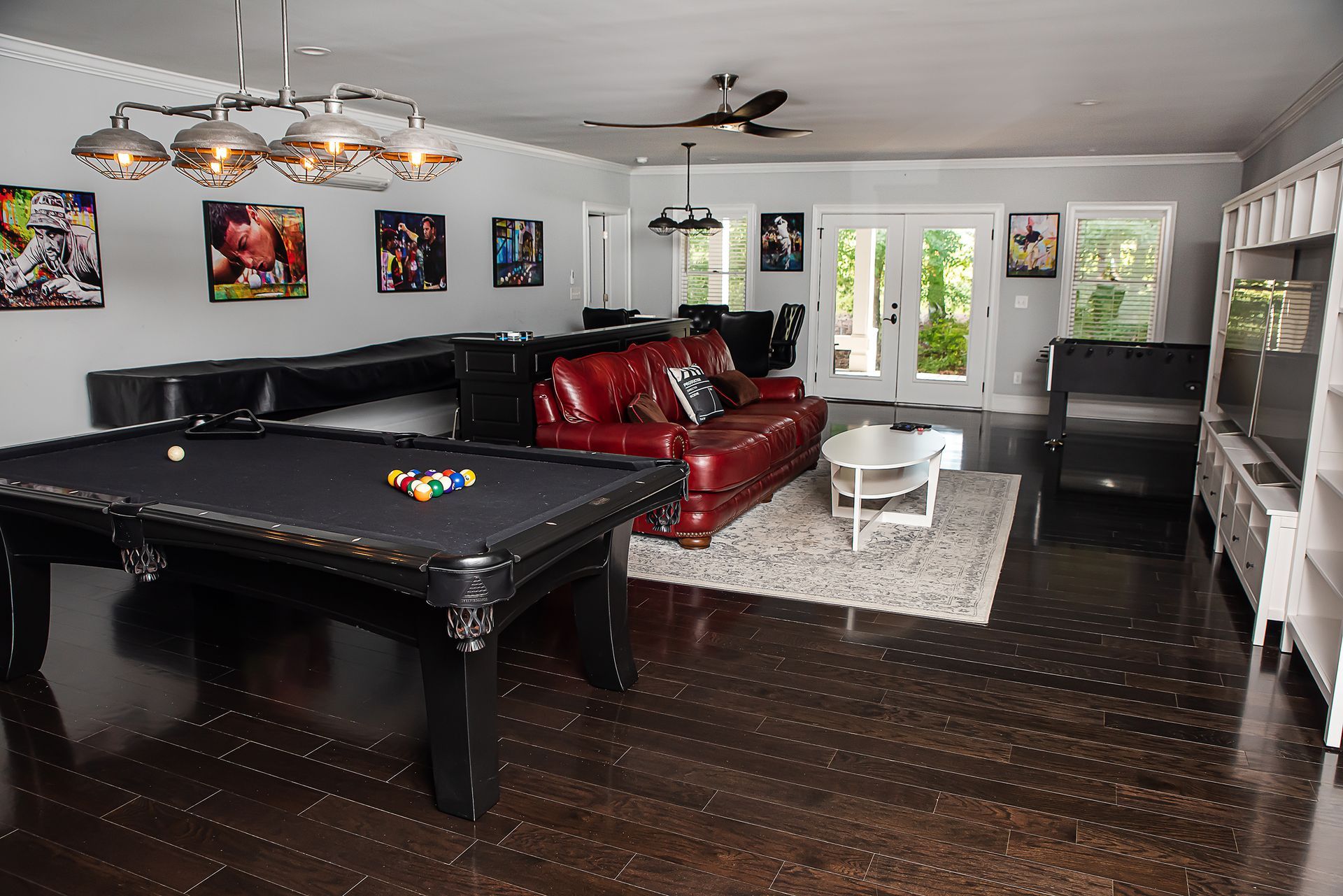 Want to amp it up? Include the downstairs for the complete package, accommodating up to ten guests with two extra rooms—one king and four queens—along with two additional bathrooms. The highlights? A full game room for epic tournaments and an indoor theatre that's tailor-made for movie nights or big-game watches. (Heads up: Accessing the downstairs requires booking the main floor too—it's all connected for seamless fun!)